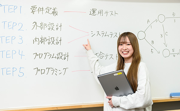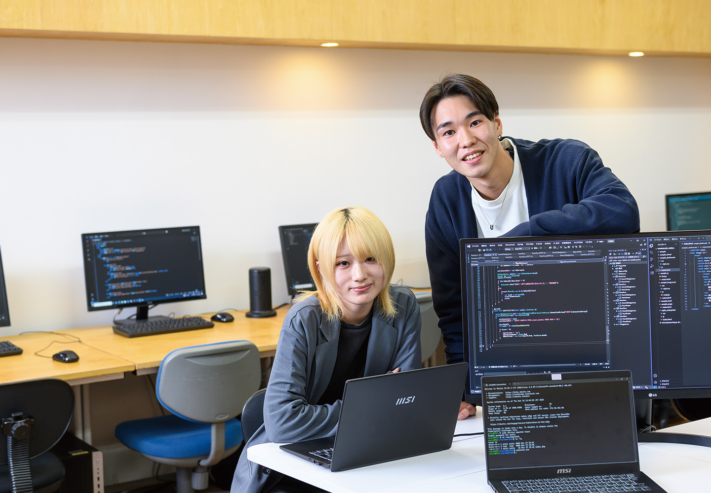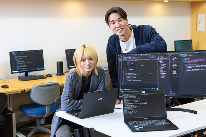 3年次から、後輩のチームを支える「メンター」を経験。教える立場として関わることで、実践力とリーダーシップが自然と身につきます。また、企画や要件定義の演習をじっくり行うので、「フルスタックエンジニア」のスキルも身につき、キャリアの選択肢が広がります。