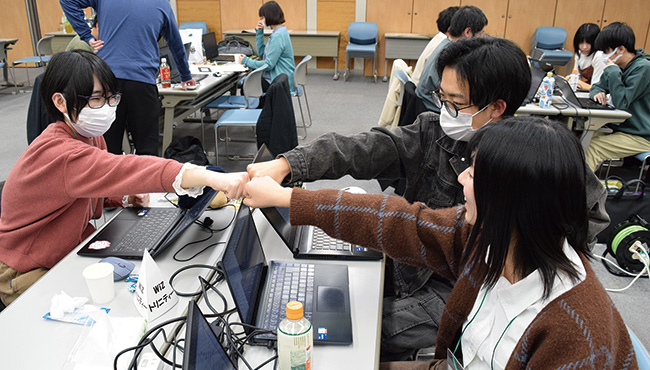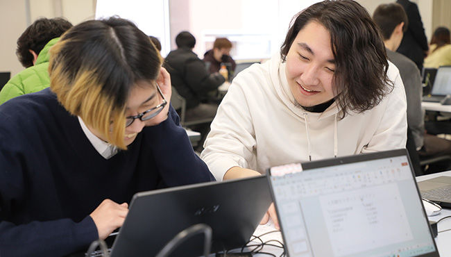 開発者育成カリキュラムの1つとして、開発イベントへの参加や産学官連携授業を数多く行っているのが本科の特長です。企業の方々とSEやプログラマが実際に職場で行っている一連の流れを数多く実践していくことで、開発現場に必要な「実践力」を身につけることができます。