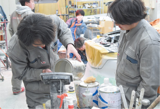 外観の塗装作業を行います。塗りムラが無いように、丁寧に何層も塗り重ねていきます。理想の色に仕上げるために、自分たちで調色を行います。