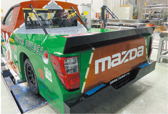 ルーフをカットしトラック化。既製品に頼らず、可能な限り学生が手作りで製作しています。さらに、MAZDAの伝説的レーシングカー「787B」をモチーフにしたカラーリングをキャンディ塗装で仕上げています。
