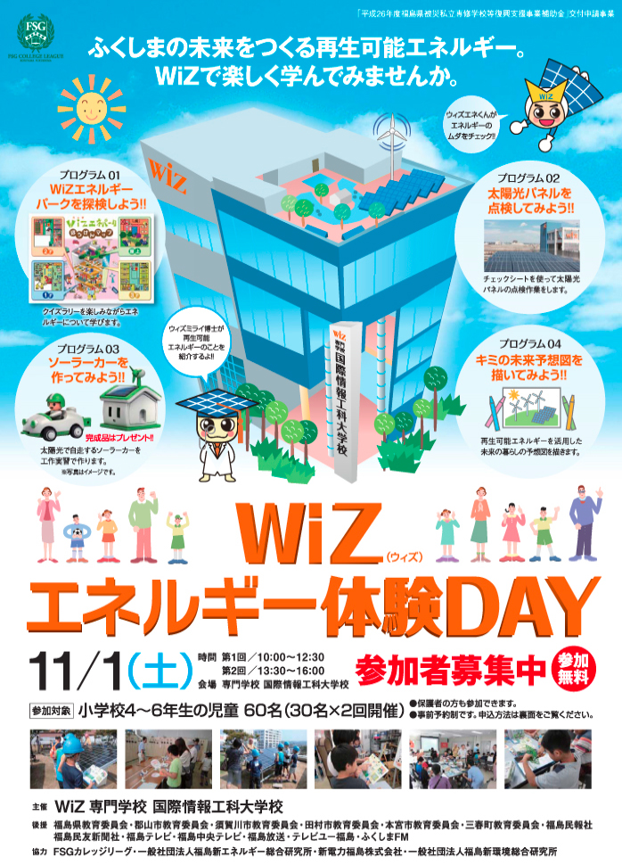 WiZ専門学校国際情報工科大学校では11月1日(土)に小学生を対象とした「WiZエネルギー体験DAY」と銘打った再生可能エネルギーの体験型講座を開催します。プログラムは、同校のスマートキャンパスを体験したり、太陽光発電システムの点検やソーラーカーの組立など盛りだくさんの内容です。対象は小学校4年生から6年生、保護者の参加も可能で参加費は無料です。時間は11時〜12時30分と13時30分の〜16時の2回行われます。この催しは「平成26年度福島県被災私立専修学校等復興支援事業補助金」交付申請事業で、復興支援活動の一環として、福島の子どもたちの人材育成を目的に開催されます。予約・問い合わせはWiZのサイトにて。